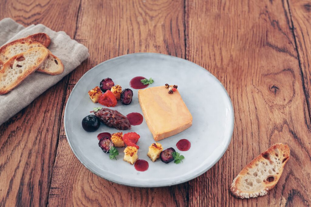 Plate the dishes: Arrange the foie gras slices, red fruits, and brioche cubes harmoniously on each plate, then add a drizzle of reduced cranberry juice for the final touch.